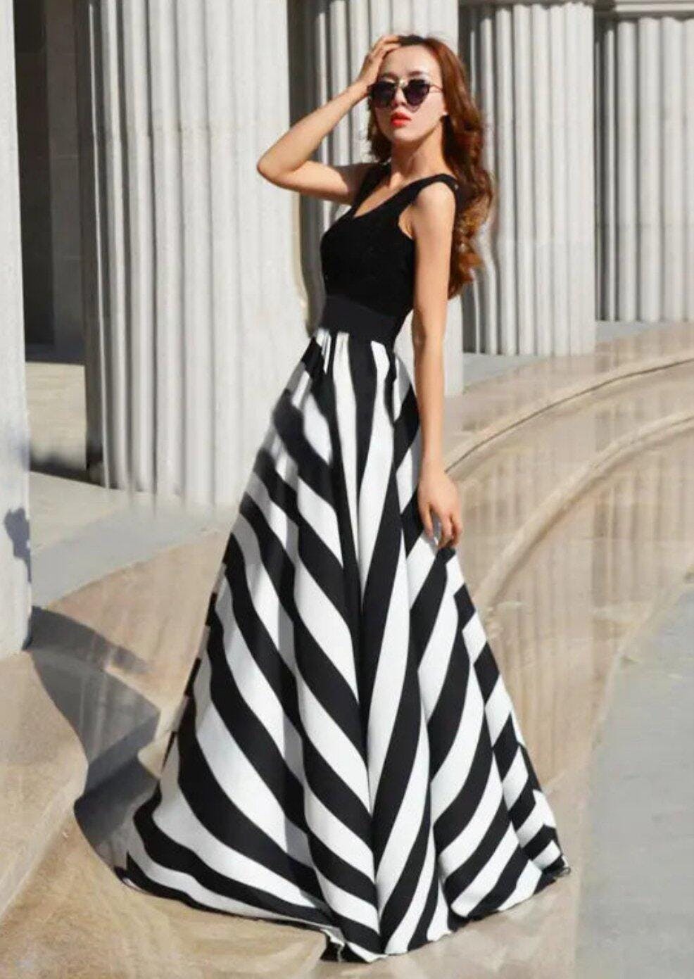 The dress features a chic black and white striped pattern that adds a touch of elegance to your wardrobe. Available in sizes ranging from S to 2XL, there's a perfect fit for everyone. Whether you're dressing up for a special event or looking for a casual outfit, this long dress is versatile enough to elevate any look.